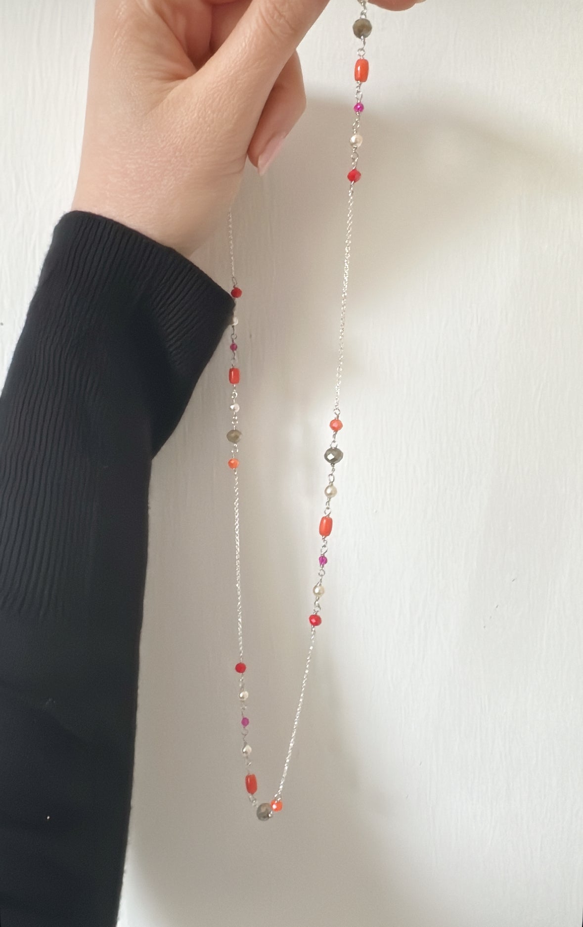 COLLANA ROSARIO CON PIETRE SINTETICHE COLOR PORPORA, VERDE, GRIGIO E CHAMPAGNE