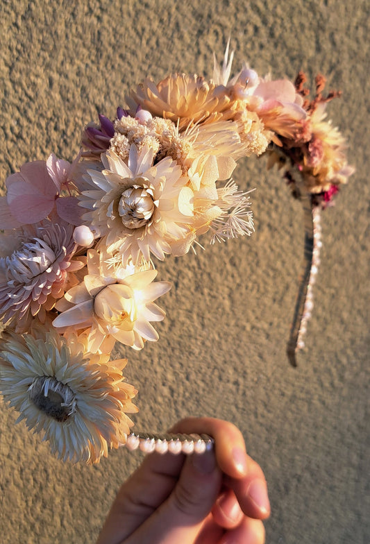 CORONCINA CON FIORI ESSICCATI E CRISTALLI AVORIO