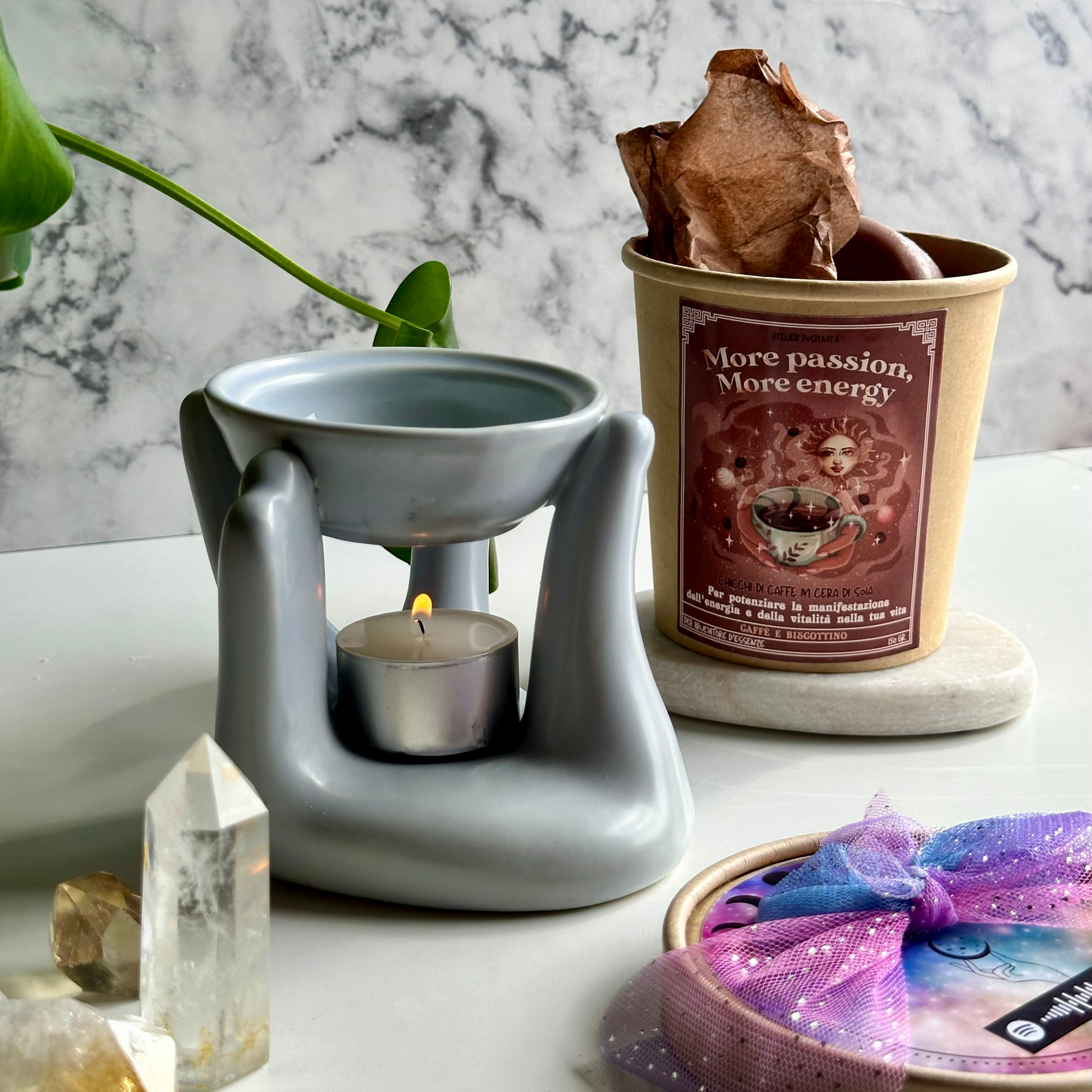 Scansiona il QR code con il tuo smartphone e ascolta la traccia ispiratrice, inviando i tuoi desideri nell'universo mentre il chicco di caffè brucia nel bruciatore d'essenze. Manifesta la tua realtà ideale con questa tart di cera unica!