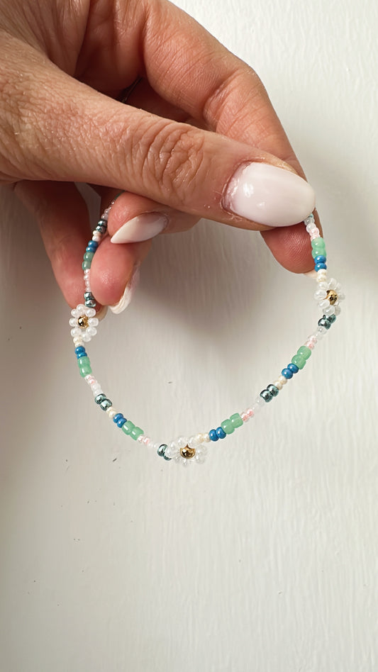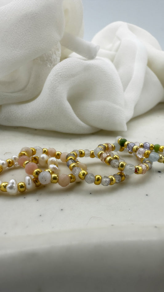 BRACCIALE CATENA A ROSARIO CON PIETRE SINTETICHE COLORE PORPORA, VERDE, GRIGIO E CHAMPAGNE