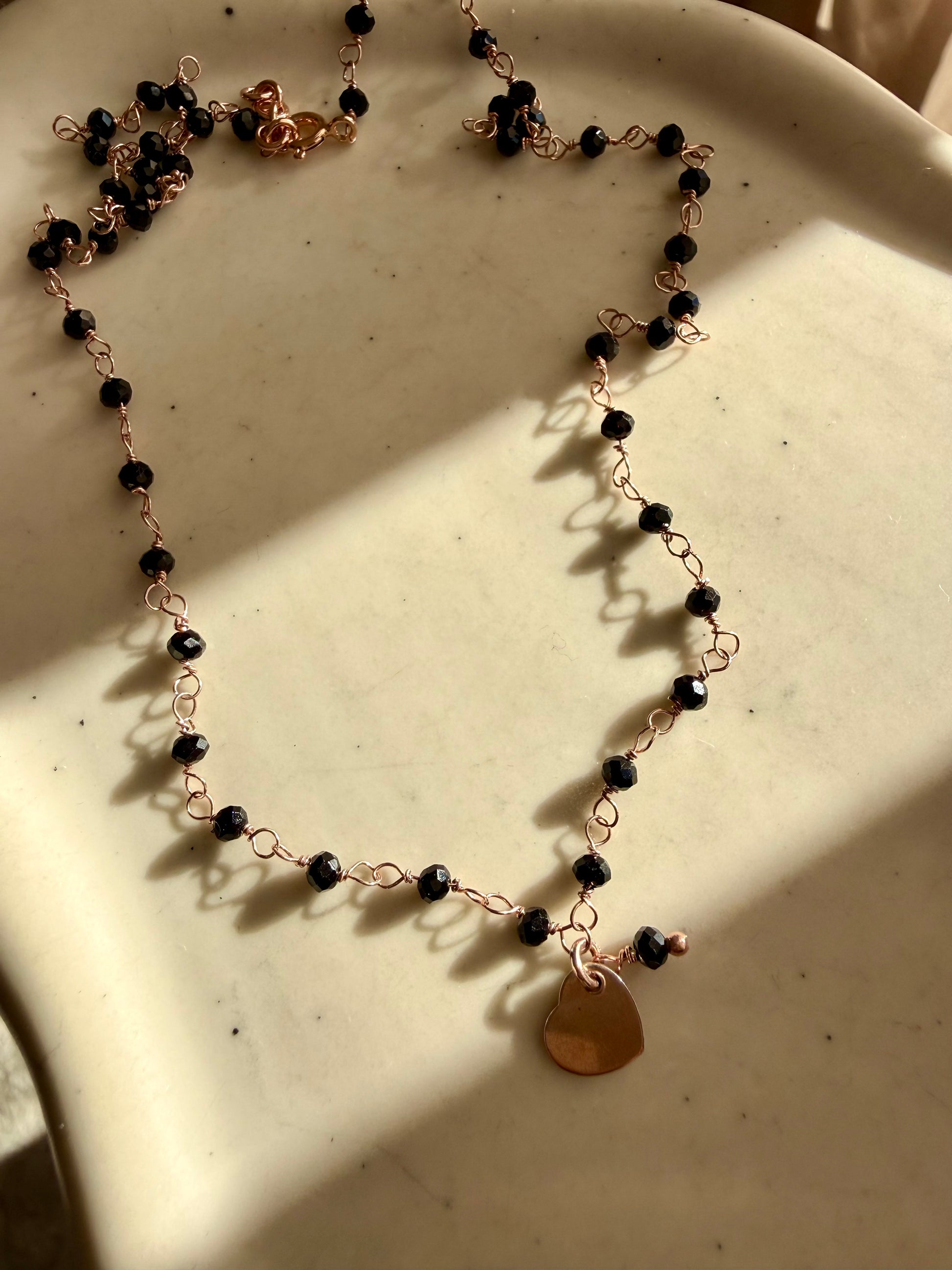 La catena è adornata con cristalli neri e un pendente a cuore con un piccolo cristallo nero, perfetto per far risaltare la tua bellezza interiore.