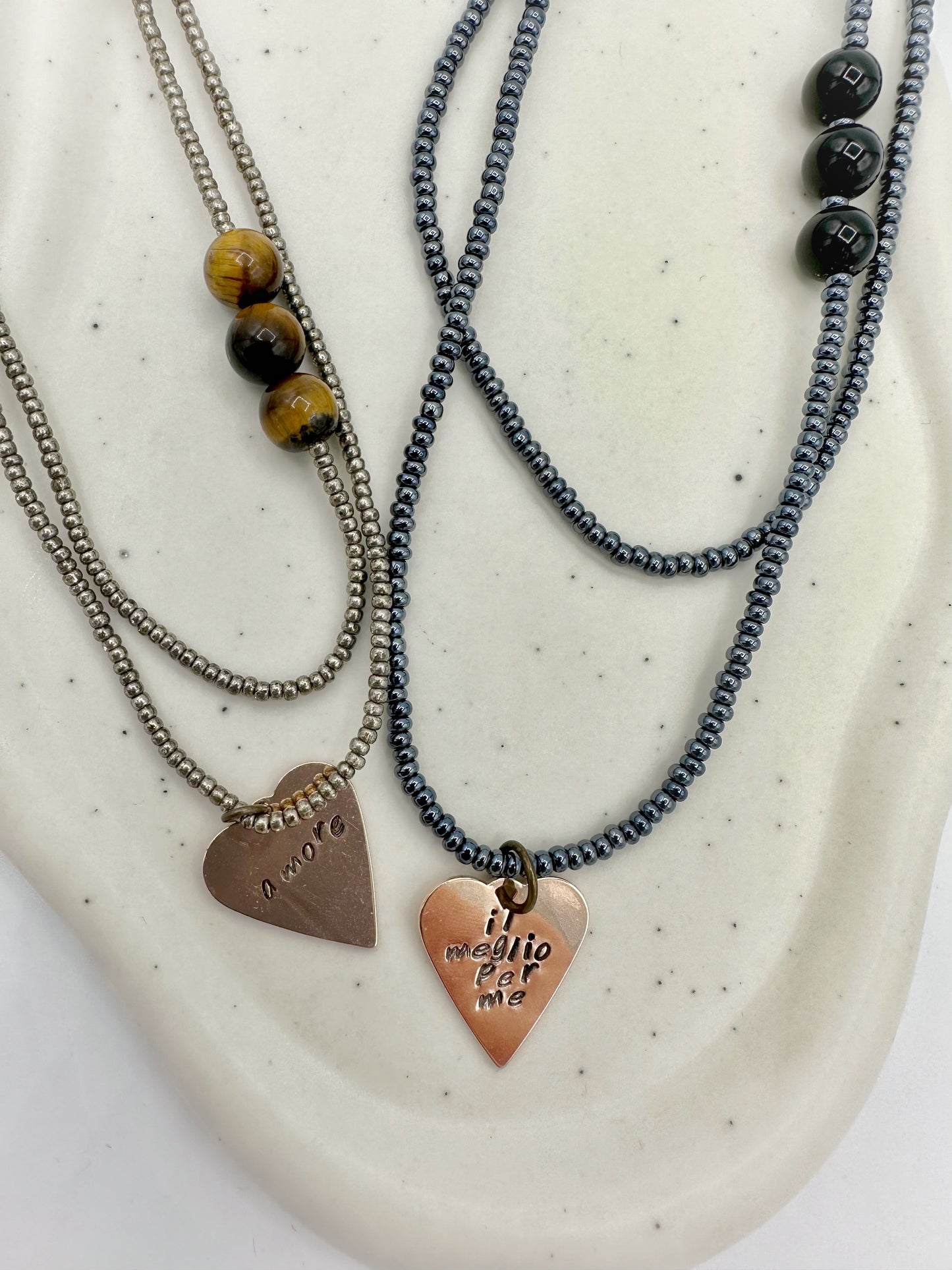 Questa collana è interamente personalizzabile: scrivici per comunicarci colore delle miyuki, tipologia di pietre naturali, forma del pendente e incisione scelti.