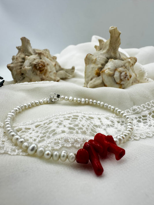 CAVIGLIERA PERLE TONDE IRREGOLARI CON CORALLO ROSSO BASE ARGENTO BIANCO