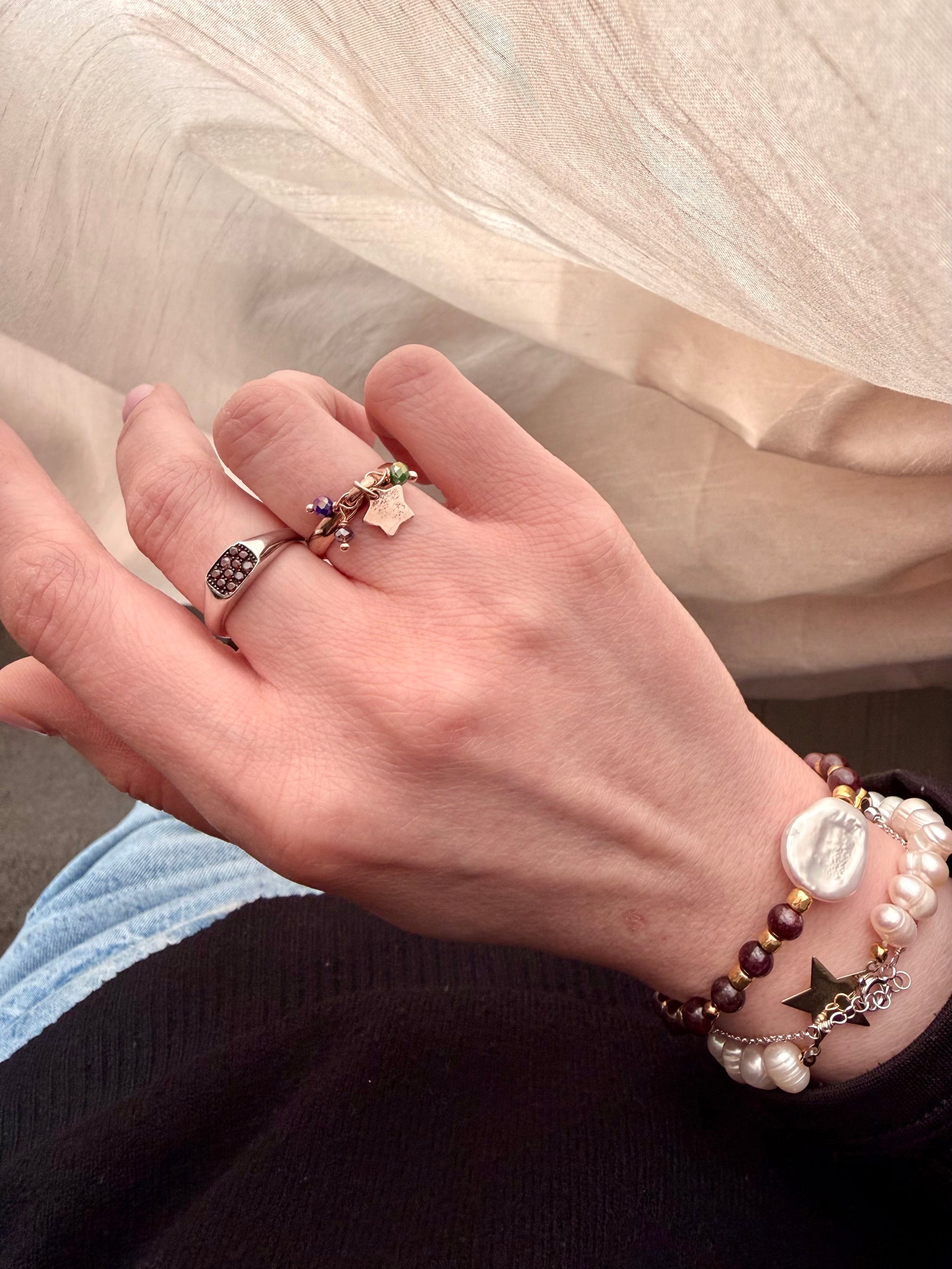 Aggiungi un tocco di eleganza e originalità al tuo outfit con questo anello unico.