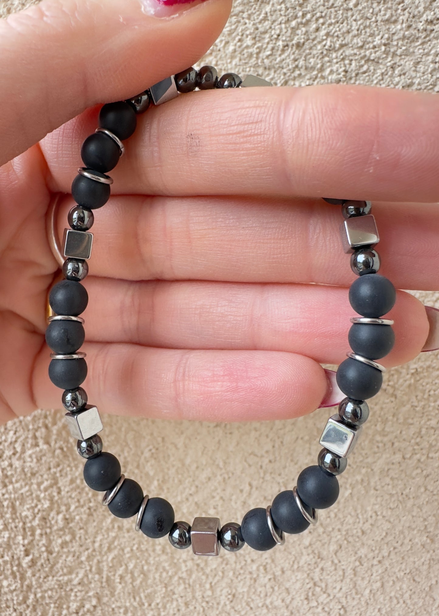 Portati fortuna e bellezza con il nostro bracciale. Realizzato con pietre naturali di onice mat ed ematite, questo bracciale elastico si adatta perfettamente al polso per un tocco di stile unico.