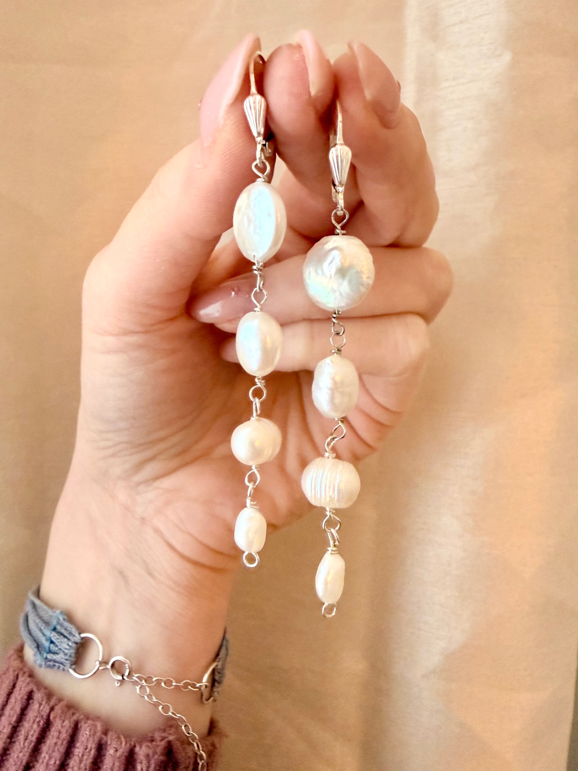 Questi eleganti orecchini presentano una cascata di perle di fiume multiforme, che donano un tocco di classe ad ogni outfit.