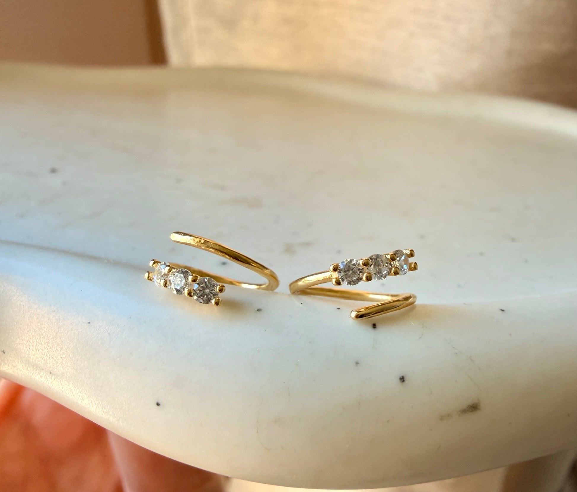 Gli orecchini a spirale con tre zirconi incastonati di 10 mm, in argento placcato oro giallo, offrono un design elegante e versatile.